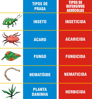 Existem diversos tipos de defensivos, cada um deles são fabricados para auxiliar no controle de pragas, doenças e plantas daninhas, que são: